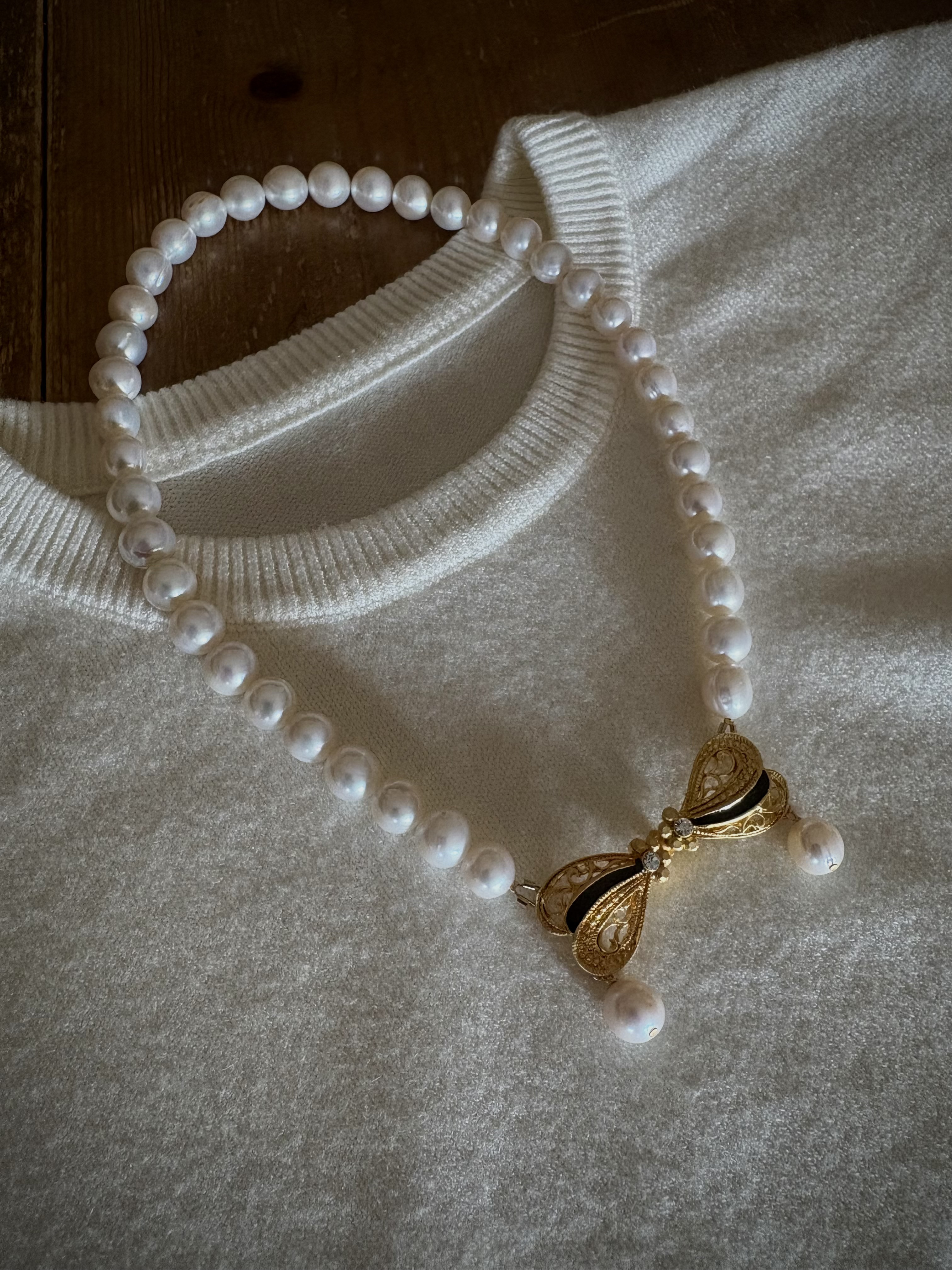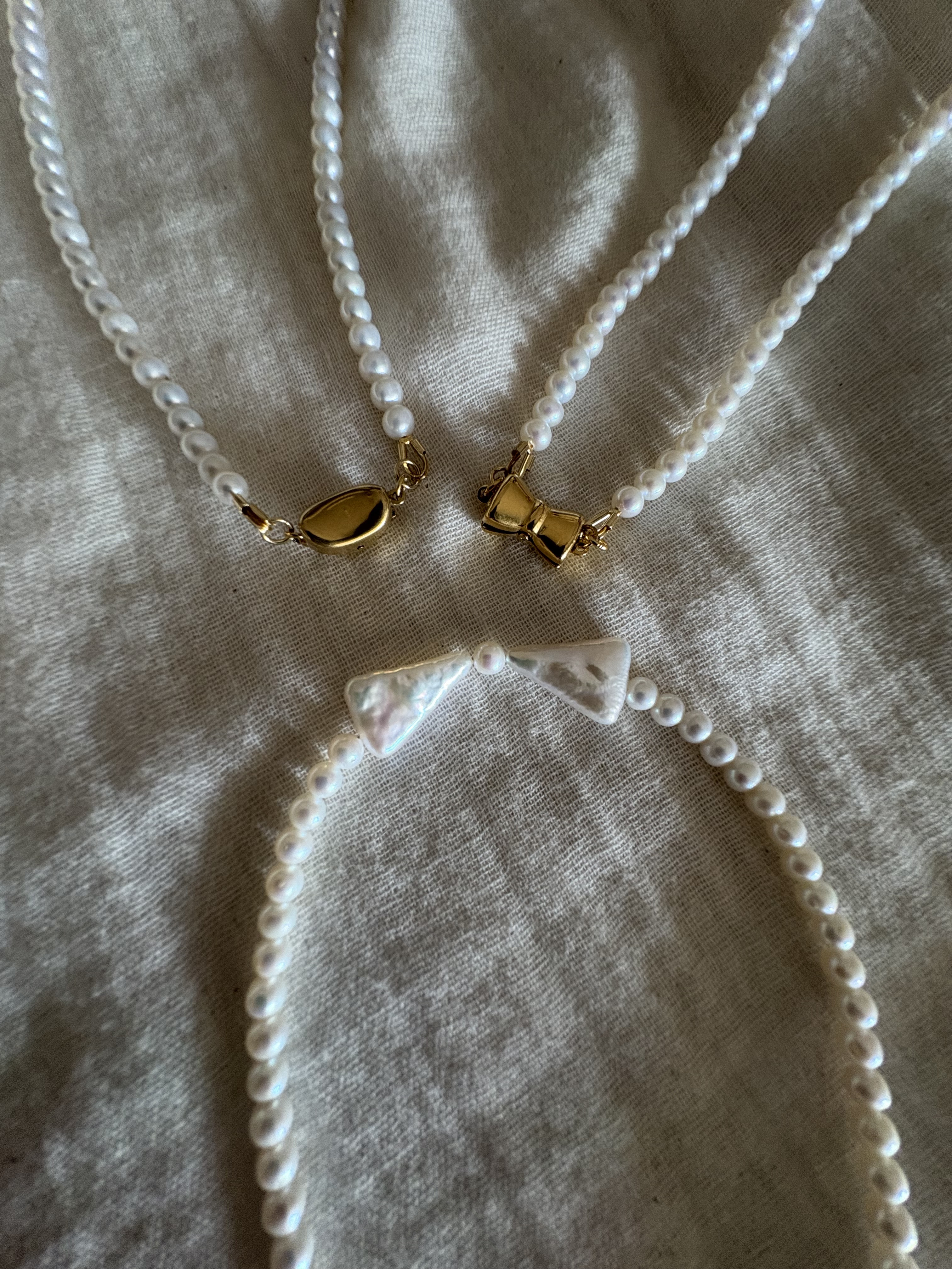 ひとつだけリボン型のクラスプ留め具をつけました🎀。