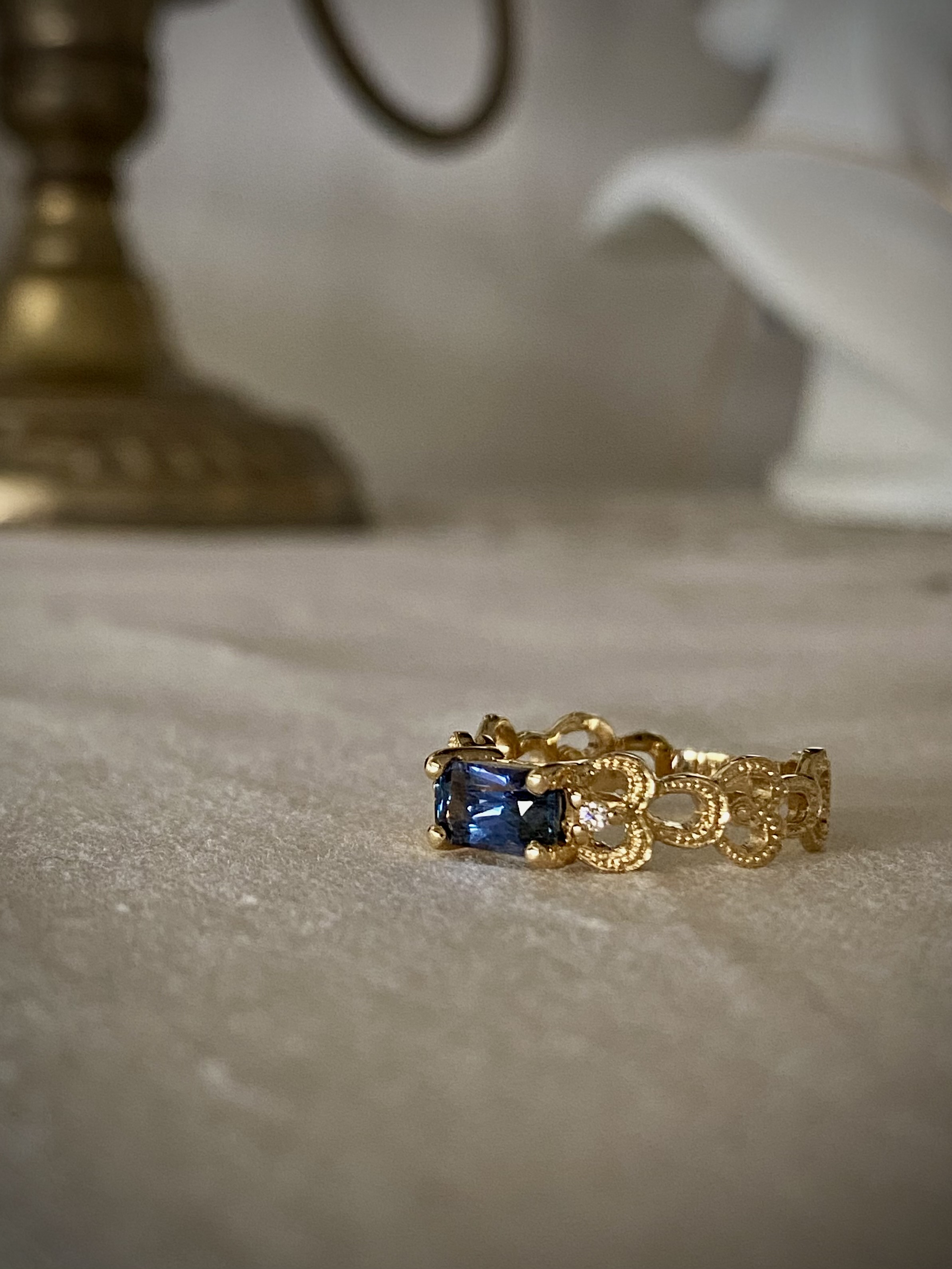 スウィートめなアームのデザインに、ロングシルエットのサファイアで凛と。