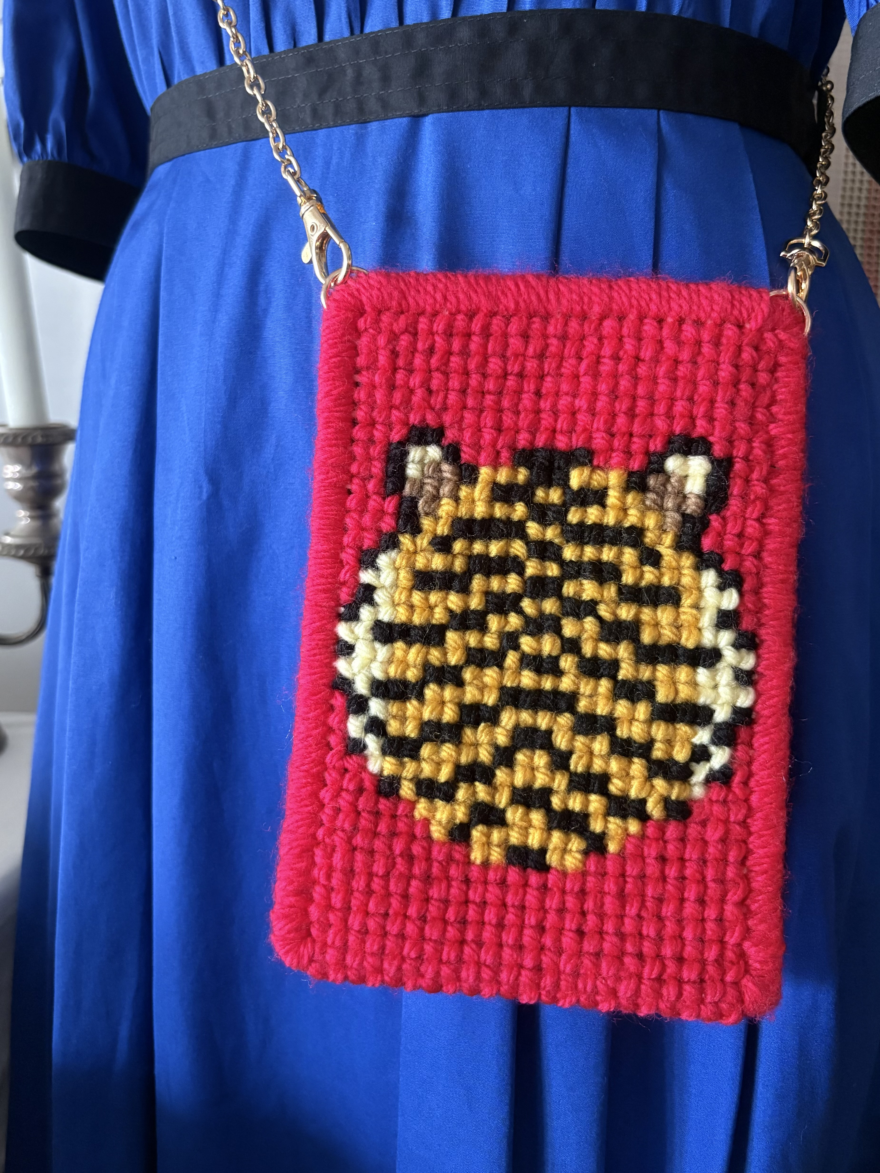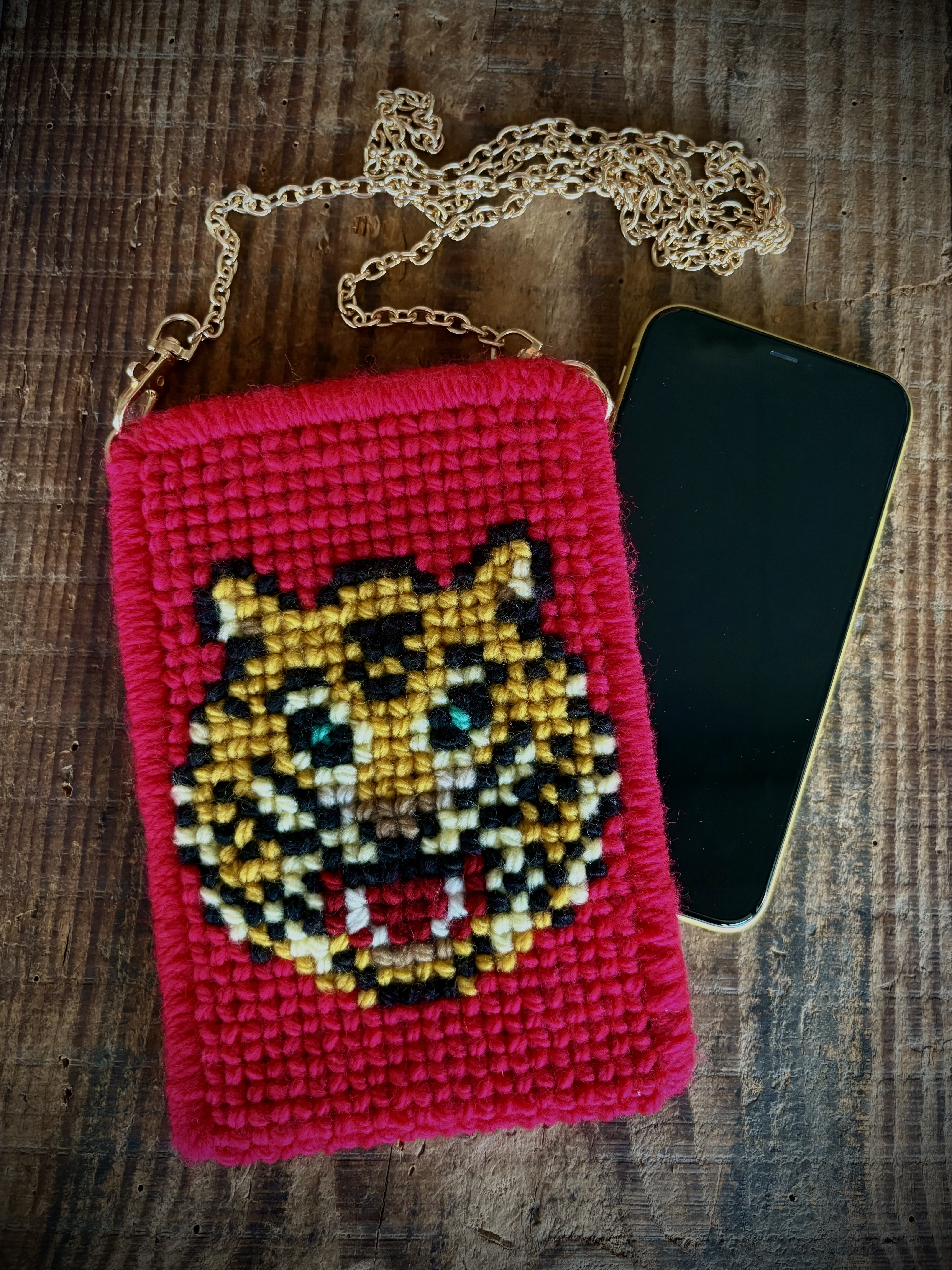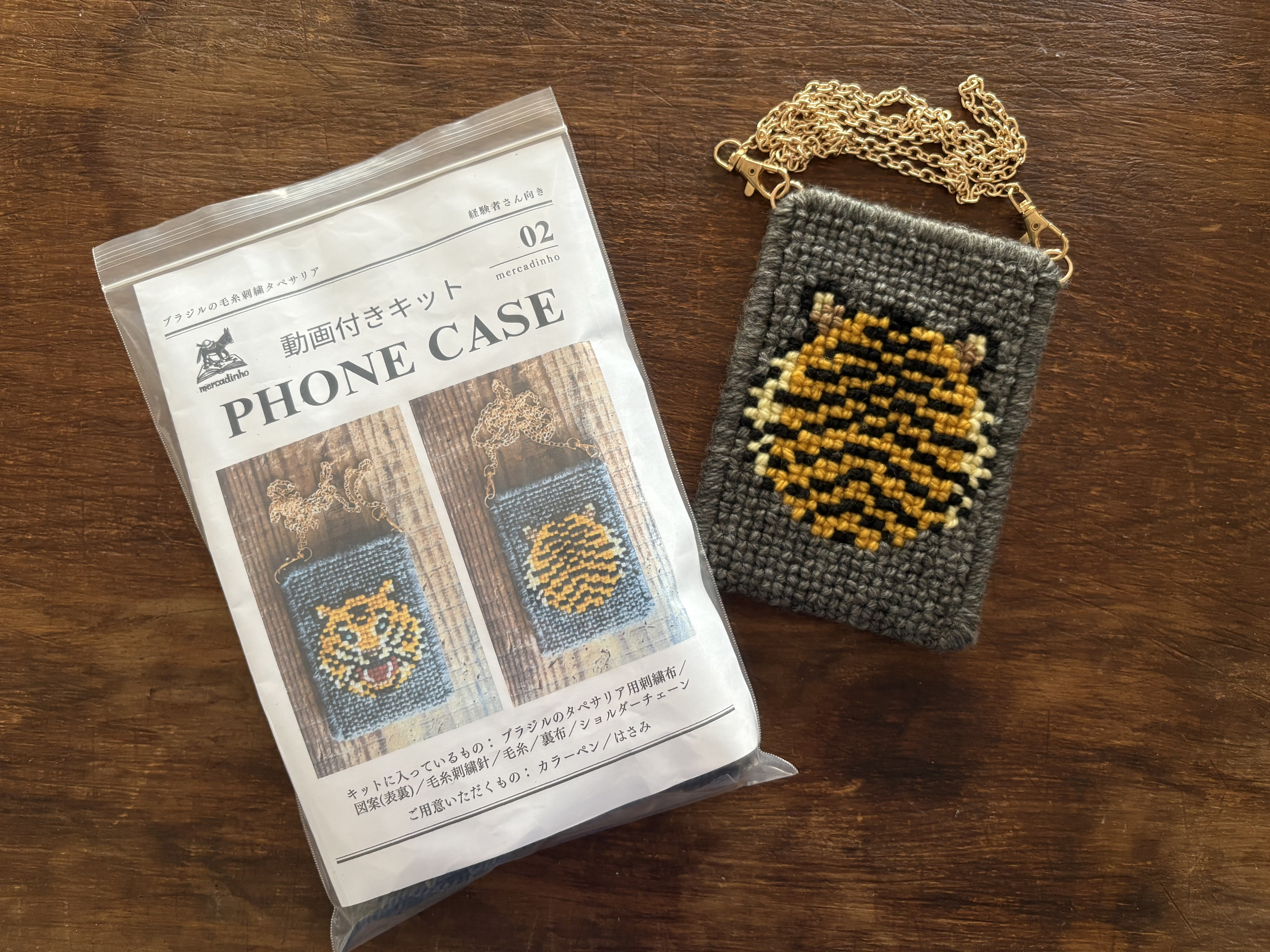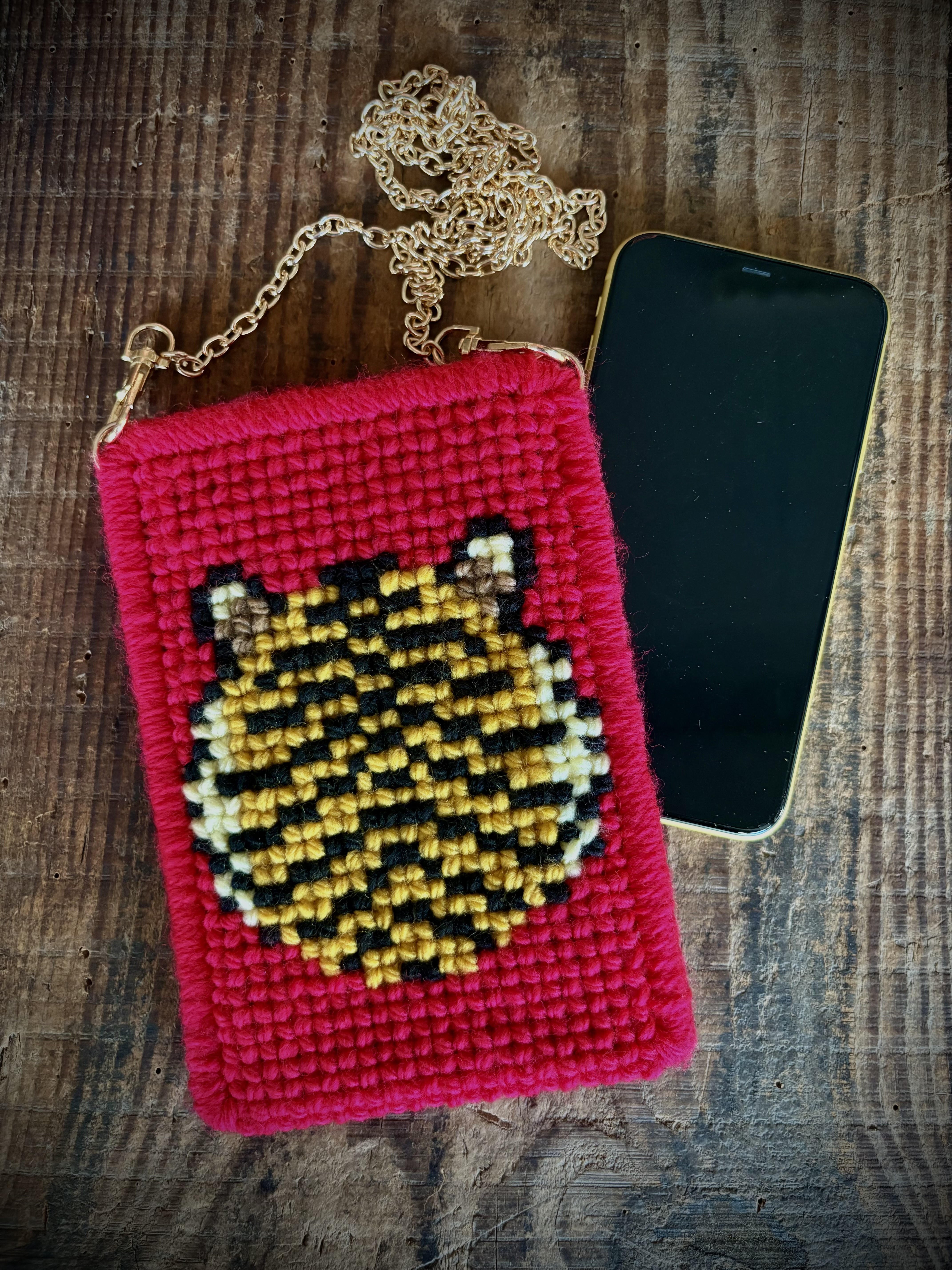 虎のスマホケース、いちばん最初に作った見本のマゼンダピンクの毛糸はメーカーさんで廃盤になってしまいました😭