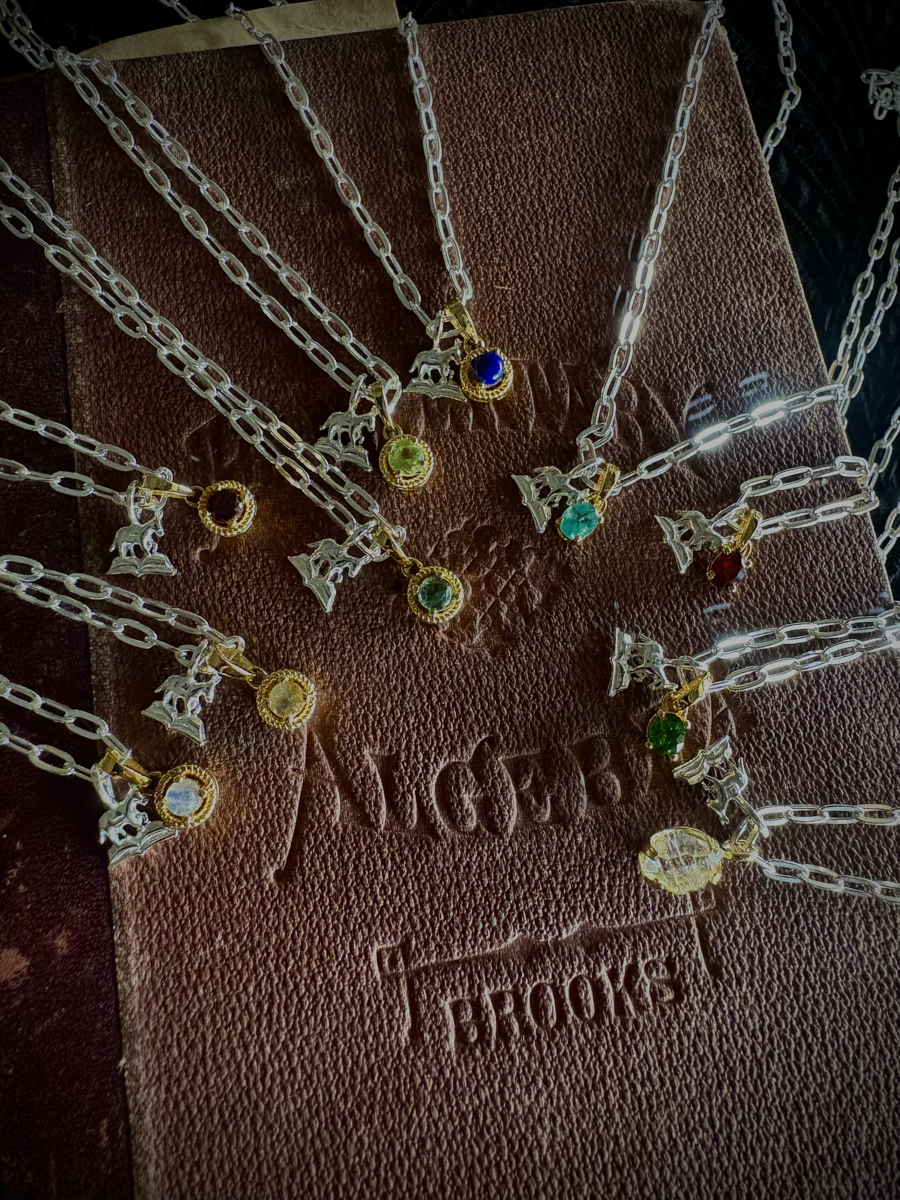 ブルームーンストーン、シトリン、ガーネット、トルマリン、ペリドット、ラピスラズリ、アパタイト、ガーネット、クロムダイオプサイト、ハーキマークォーツです。