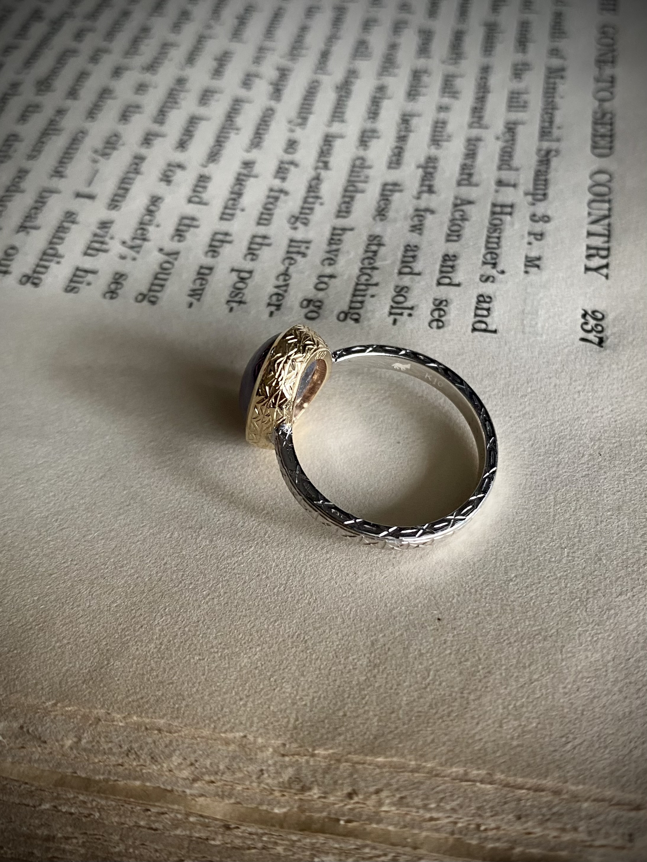 お石をフクリン留めして同様の彫りを入れる【Talisman】というセミオーダーリングをご紹介することが多かったですが、幅が広いと文様ががよく見えますね。