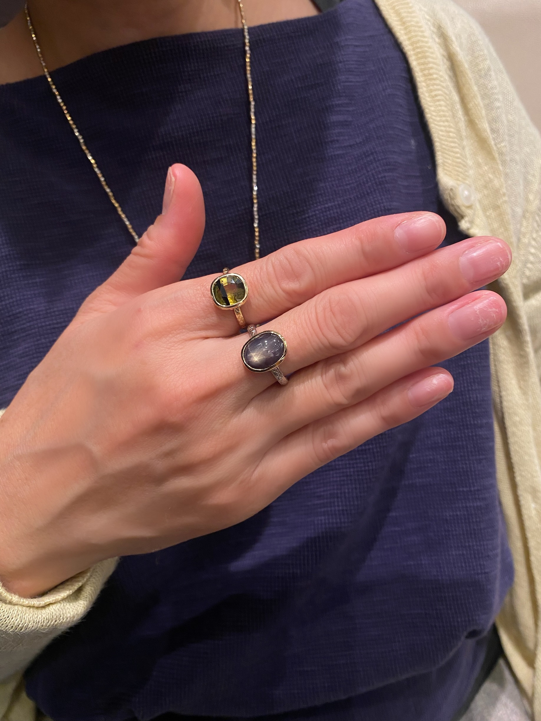 ちなみにたくさんの方が気になってご試着くださった1枚目の写真のシュガーローフカットのプレナイトリング。残念ながら皆さまサイズ合わずで、アトリエに一緒に帰りました。